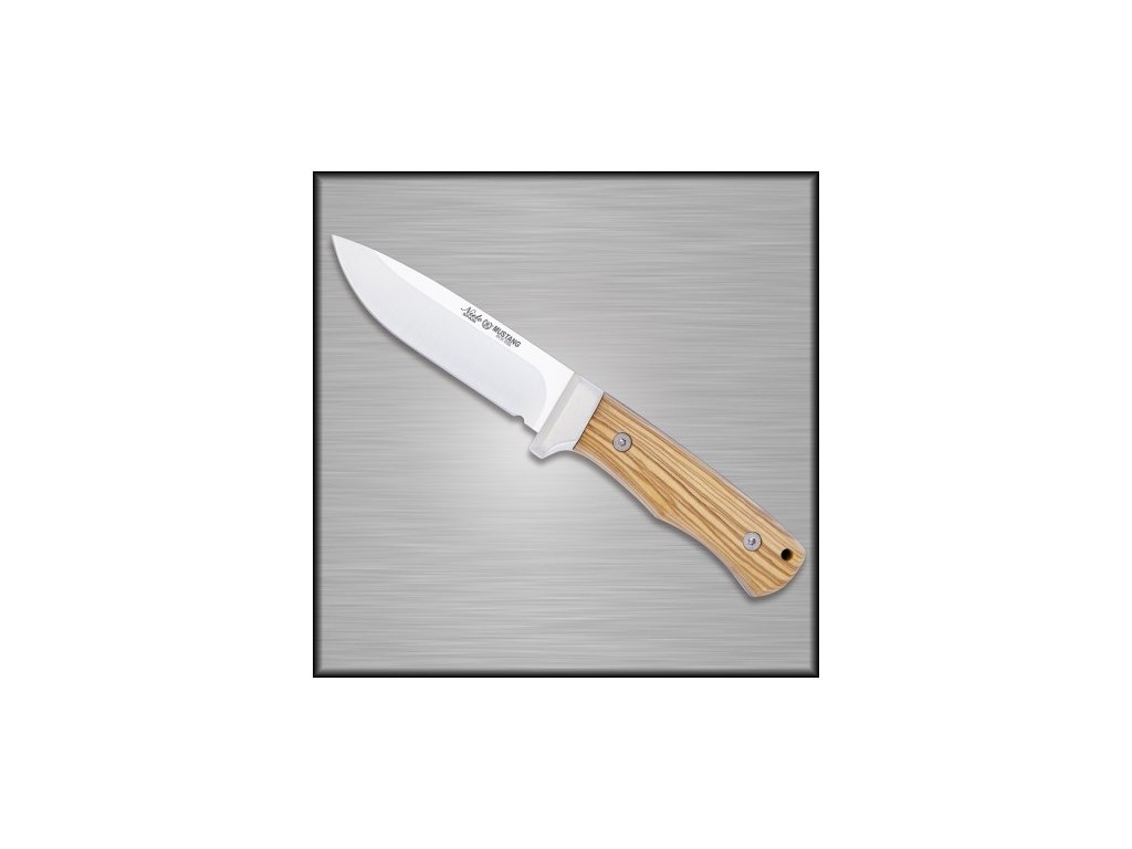 Miguel Nieto Mustang 6403. Elegantný a štýlový nôž. Skvelý nôž do lesa, na kempovanie, pre fanúšikov outdooru, bushcraft, survival. Tvar čepele spolu so svojim full tang prevedením robia tento nôž skvelým pomocníkom pri akejkoľvek práci. Čepeľ noža ma dĺžku 14 cm a hrúbku 4 mm. Je kovaná z ocele odolnej proti korózii AN 58. Táto oceľ má jedinečné schopnosti držania ostria a zároveň je jednoduchá na údržbu. Rezná hrana je plochá, aby poskytla väčšiu pevnosť a lepšiu schopnosť držania ostria. Rukoväť je vyrobená z prírodného dreva Oliva, tak aby dokonale sadla do ruky. Na jej konci sa nachádza otvor pre šnúrku, ktorá zabezpečuje, aby nôž pri práci nevypadol z ruky. Nôž má kožené púzdro s logom firmy Miguel Nieto.
